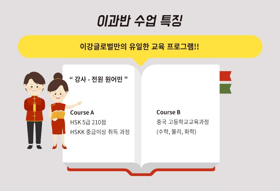 대치이강글로벌에서는 중국유학을 위한 중국어수업 및 입학을 위한 기초과목에 대한 모든 수업이 이루어지고 있으며, 1년간 열심히 공부해나간다면 누구나 대치이강글로벌과 협약된 대학에 입학할 수 있습니다.