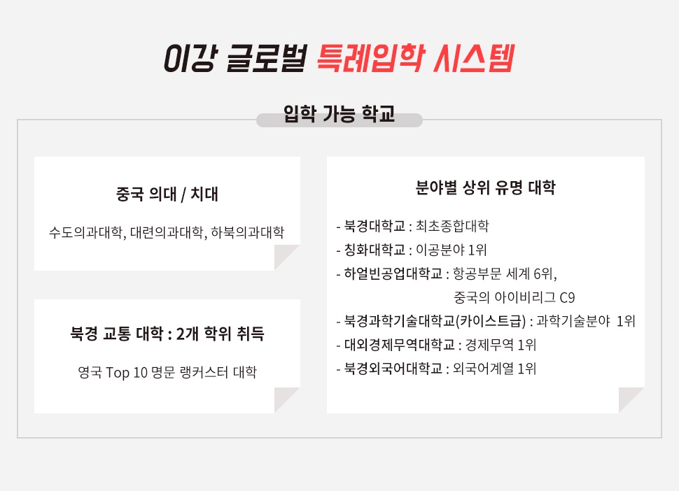 여러 기업들의 글로벌 인재 수급에 대한 니즈를 바탕으로, 대치이강글로벌에서는 중국 유명 대학과 MOU 및 협약을 통해, 대치이강글로벌에서 훈련받은 학생들 대부분 각 대학으로의 입학을 허가해 주고 있습니다. 이미 대치이강글로벌을 통해 지난 3년간 ‘수도의과대학’, ‘북경과학기술대학’, ‘대외경제무역대학교’ 등으로 학생들이 입학하여 우수한 인재로 양성되고 있습니다.