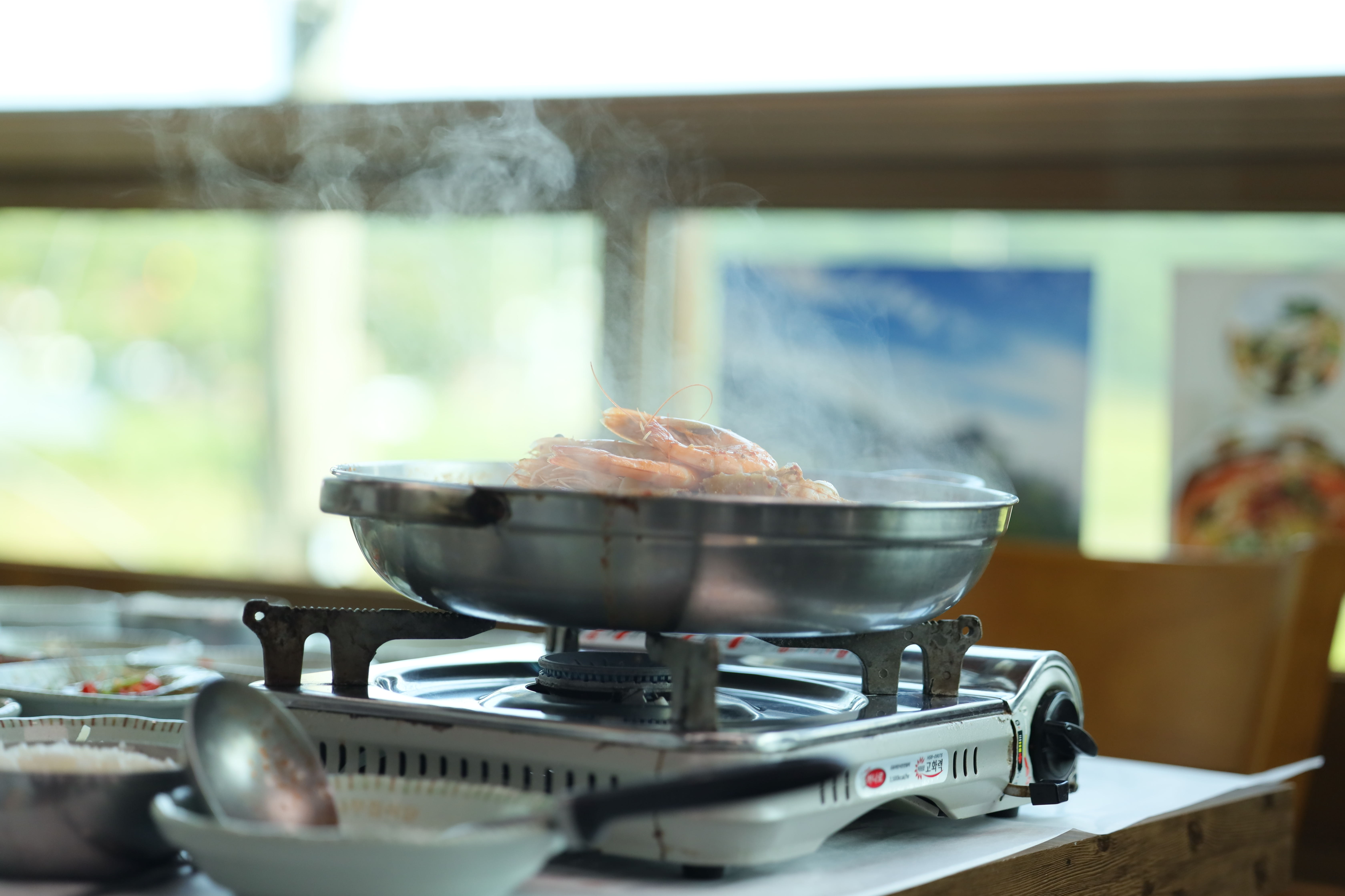 여러 해산물과 야채들이 듬뿍 올라가 푸짐한 찌개가 바글바글