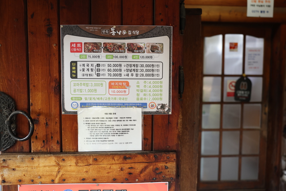 딴뚝통나무집식당에서 대기하면서 메뉴를 보니까... 세트메뉴를 먹어야 하겟더라구요. 게장이 3가지, (간장게장, 새우장, 양념게장)이 나오고, 거기에 게국지가 함께 나오는 아주 합리적인 메뉴 이기에 ㅋㅋㅋㅋ